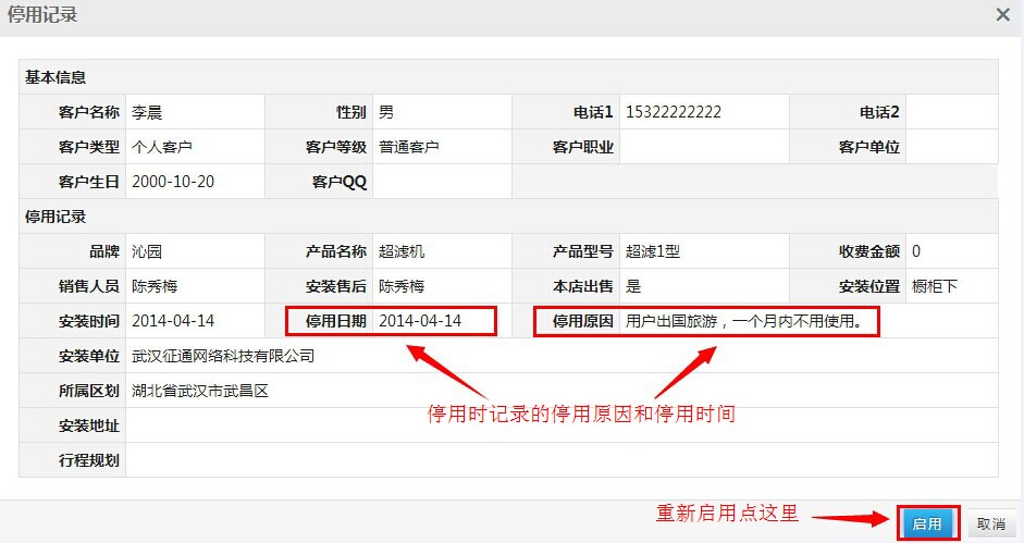2、所有停用的净水器会统一在“记录查询”的“水机停用记录”页面显示: